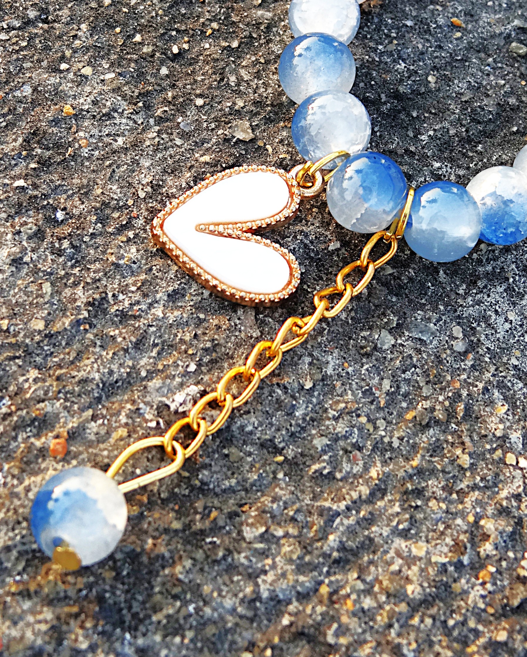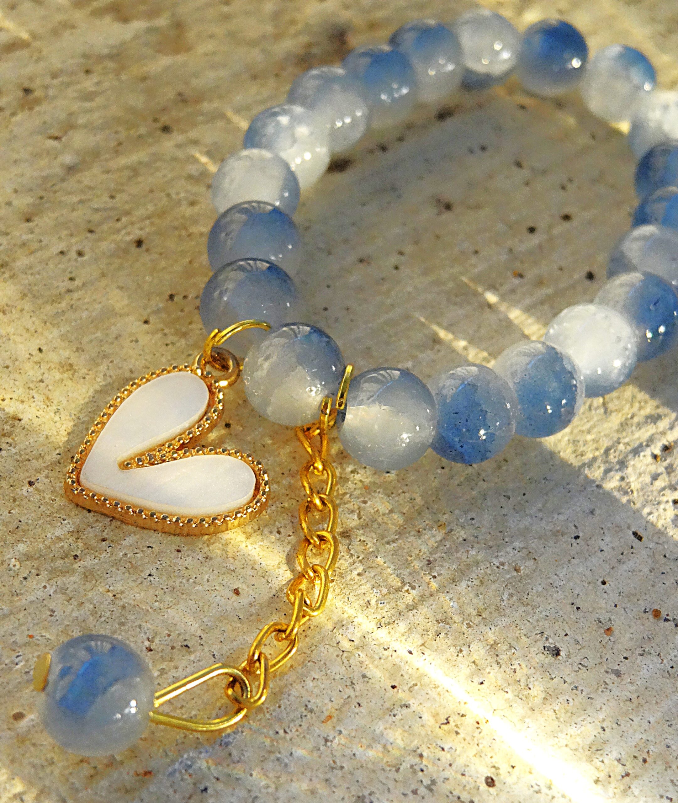 Radiate elegance with Blue Glow, a stunning bracelet featuring a graceful blend of soft blue beads and golden accents, finished with a charming heart pendant.